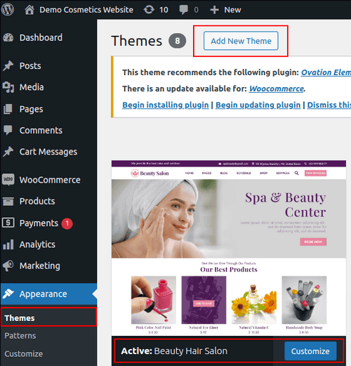 The concept is to be different from all the rest in the beauty market. A well-designed theme creates a unified brand look that attracts your target audience. To upload a theme in WordPress, go to Appearance > Themes, click Add New, then Upload Theme, select your theme’s .zip file, and click Install Now followed by Activate.