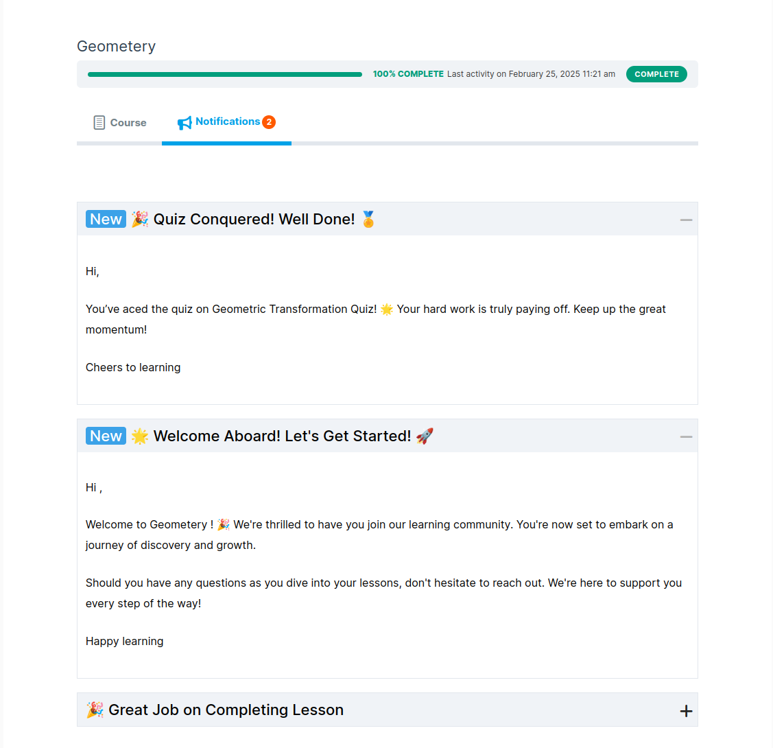 All your announcements are not only sent to users via emails but also visible to them on frontend in a separate Notifications tab on LearnDash Couse page.