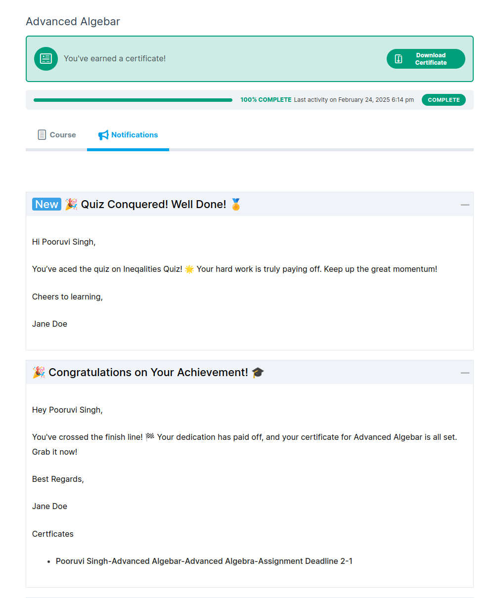 Student Email Notifications integrates with Multiple certificates pro for LearnDash and displays all notifications triggered by like group certficates, course certficates, lesson certificates and quiz certficates.