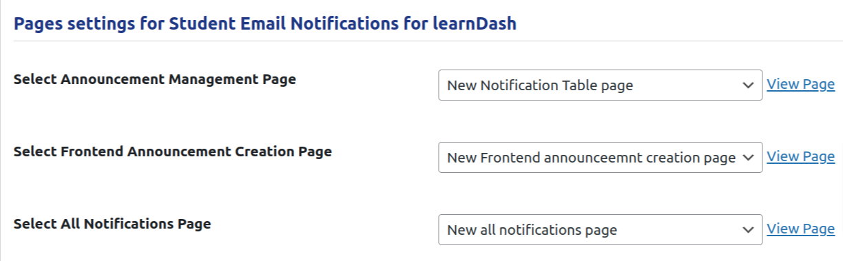 Select Frontend Announcement Creation Page : This setting allows you to change the page where the shortcode [stuanld_student_filter_frontend] for the Frontend Announcement Creation page appears. Select the page and the shortcode will automatically be inserted in the page .