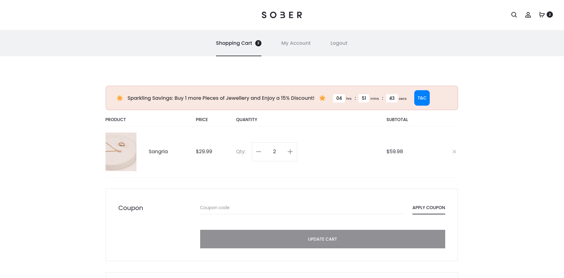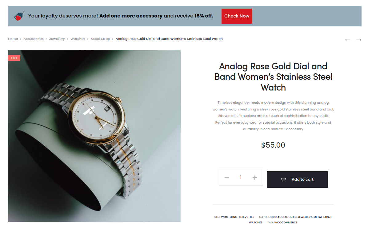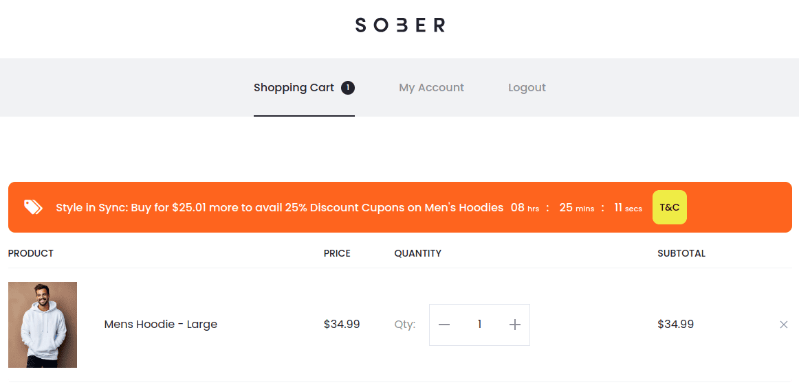 A message like, “Add one more clearance item to your cart and enjoy an extra 10% off!” displayed on the WooCommerce cart page helps drive customers to purchase more sale items and clear out inventory.