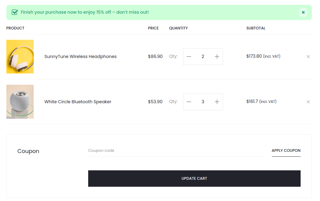 Display a message like, “Complete your purchase now and get 15% off!” on the WooCommerce cart page to recover abandoned carts.
