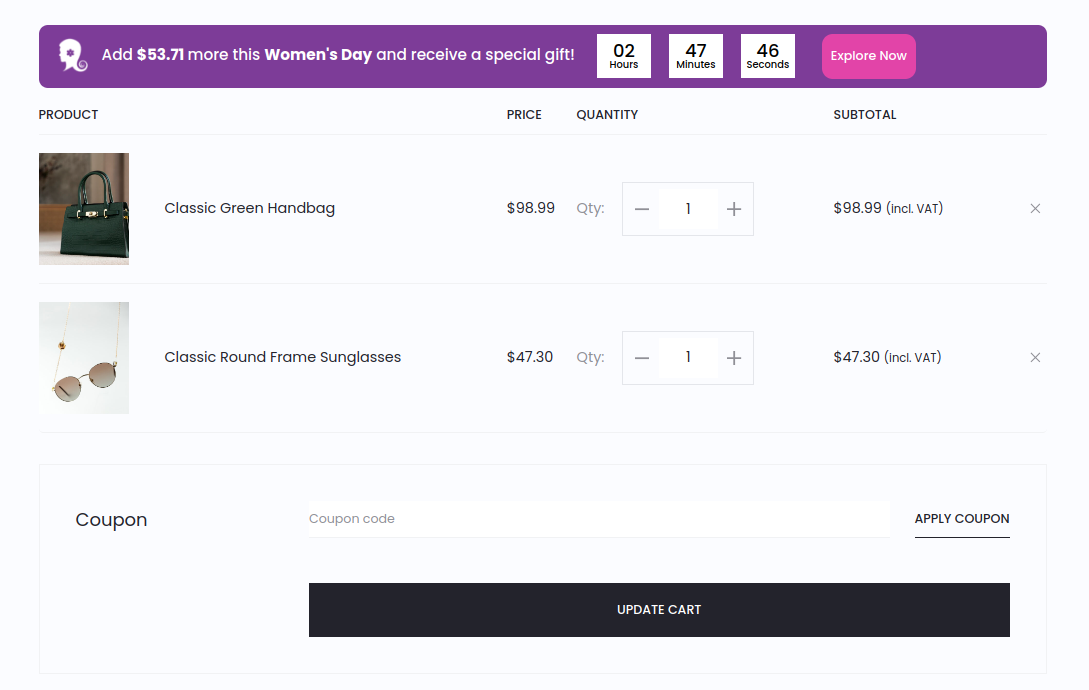 By adding countdown timers for flash sales or alerting customers about low stock items in their cart, you can motivate them to act quickly before missing out.