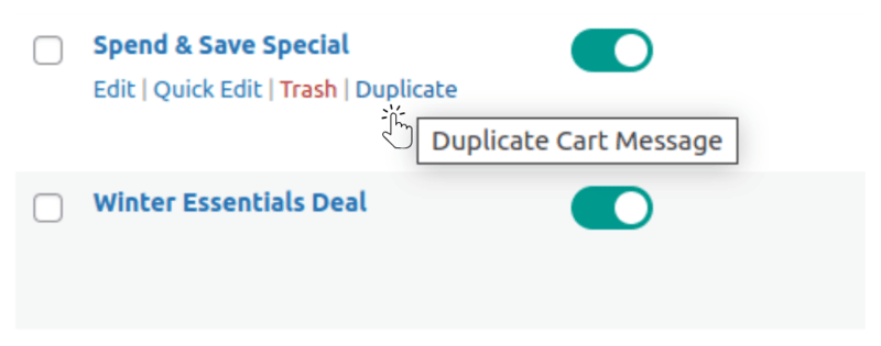 Need to launch new promotions fast? The Duplicate/Clone feature lets you quickly copy an existing WooCommerce cart message and tweak it for fresh campaigns. Perfect for seasonal sales or repeat offers, this feature saves time by allowing you to replicate successful cart messages without starting from scratch.