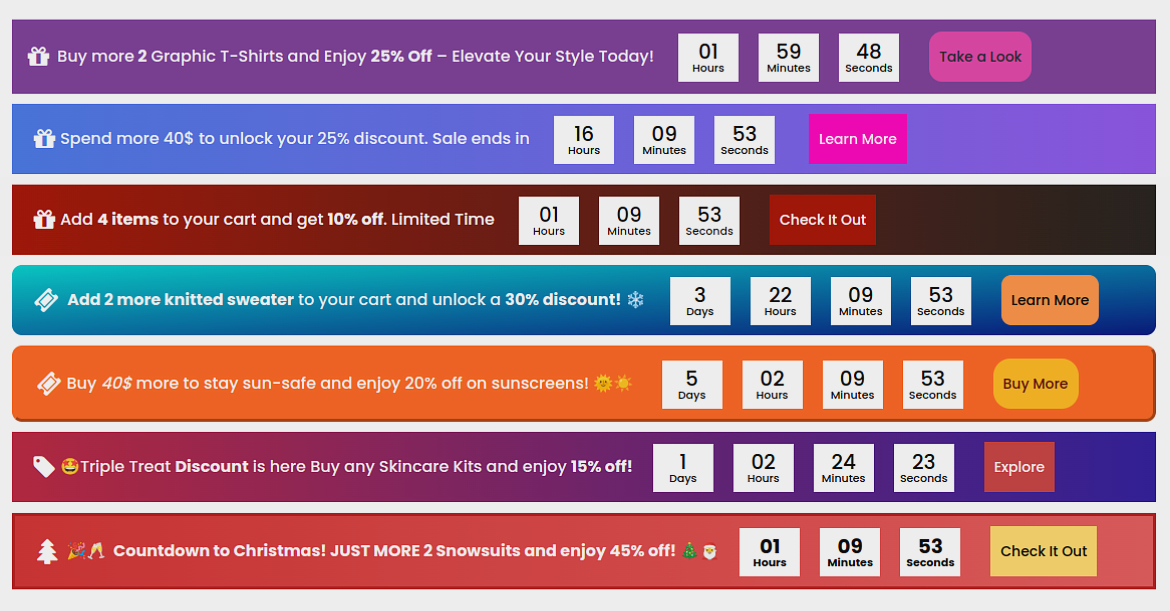With the flexibility to display messages on the Cart, Checkout, and Product pages, you can strategically influence purchasing decisions at every step. And by setting countdowns, you create a sense of urgency, prompting swift purchasing decisions.