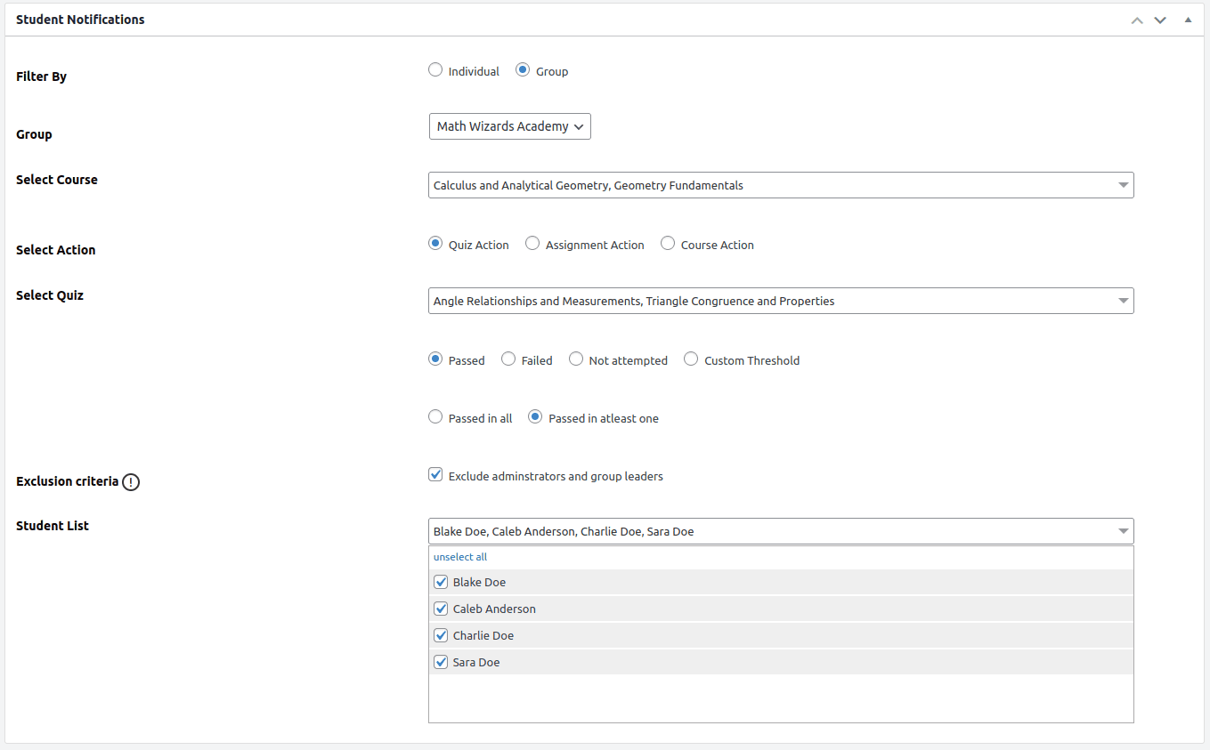 With advanced filtering options, you can target students who are lagging, excelling or need specific attention. This precision ensures that each student receives the right message at the right time via LearnDash email notifications, making your communication more effective and goal-oriented.
