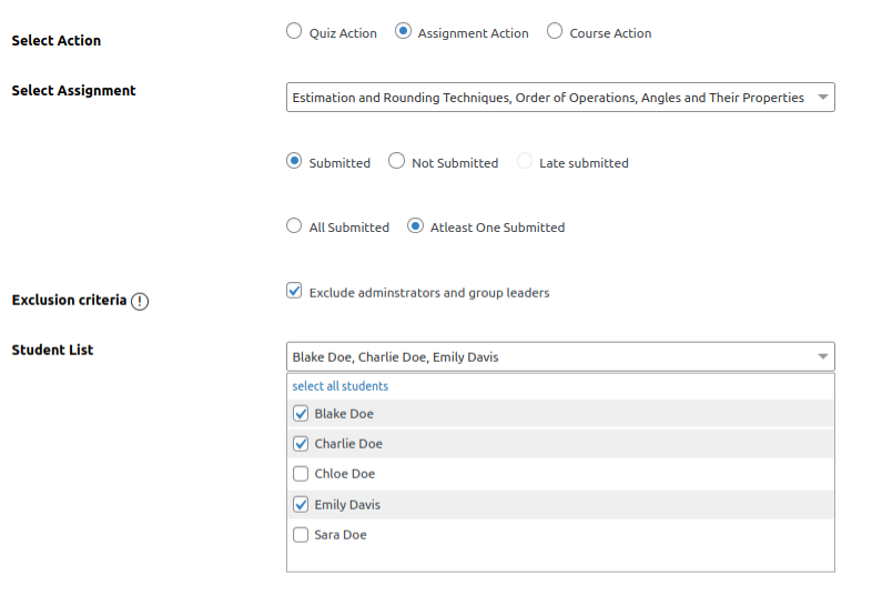 Assignment Action Filters: Keep students on track with reminders and praises for assignment submissions.