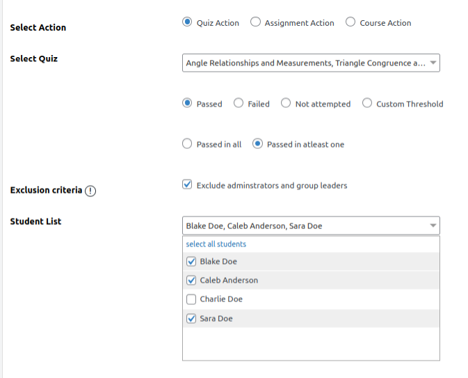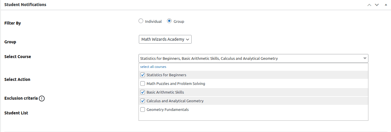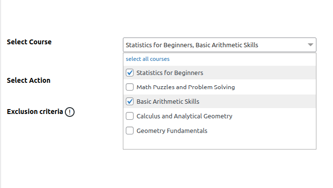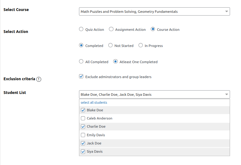 Course Action Filters: Segment students based on their course journey – completed, in progress, or not started.