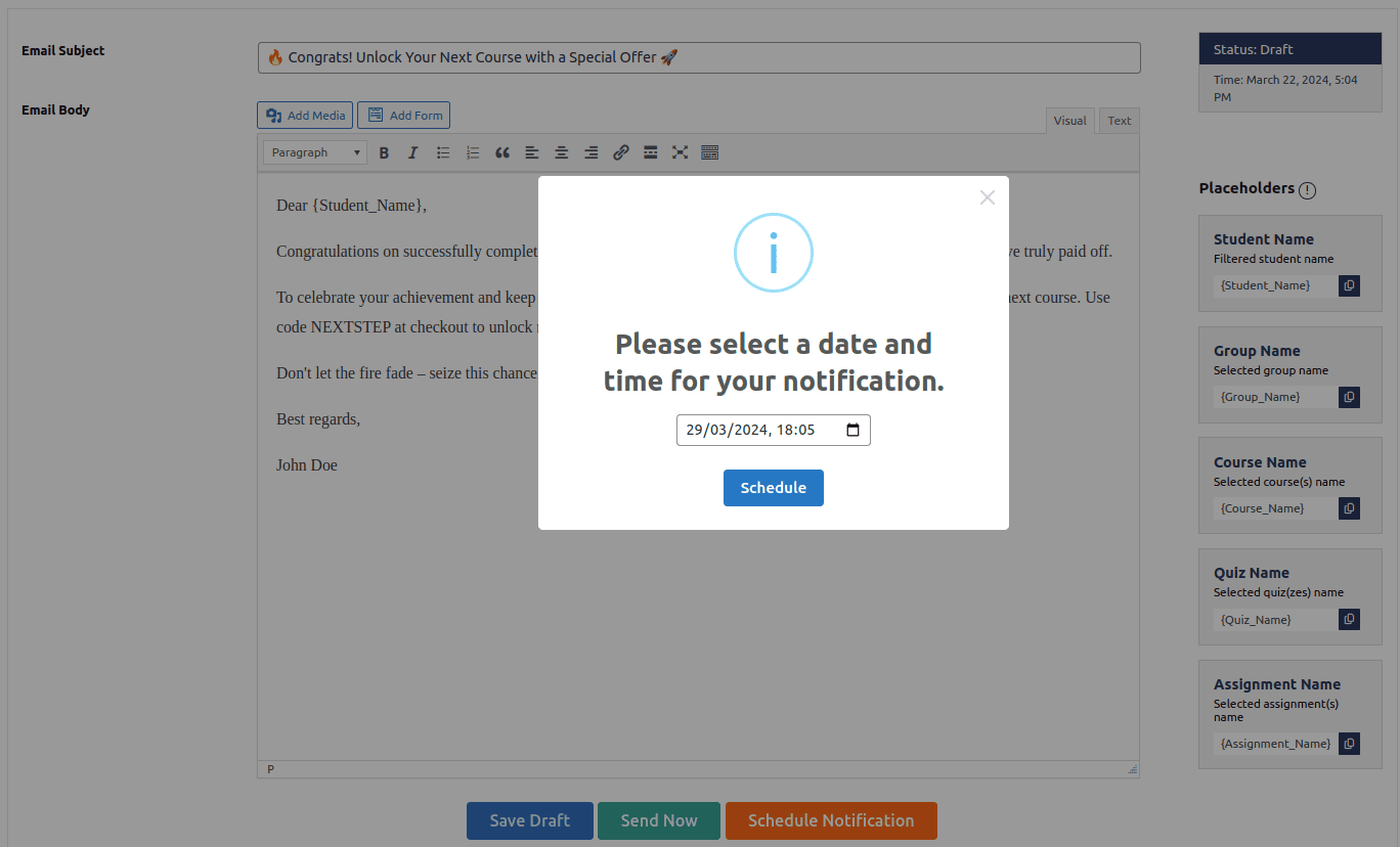 The ability to craft messages with customizable placeholders like {Student_name}, {Course_name}, and more ensures that each student receives a personal touch.