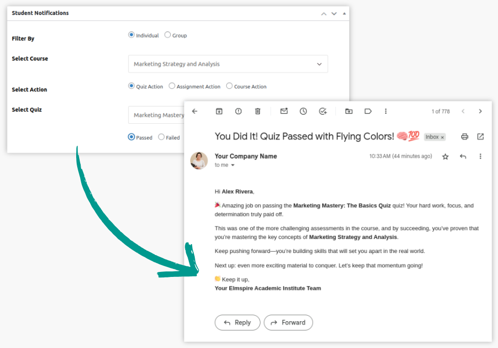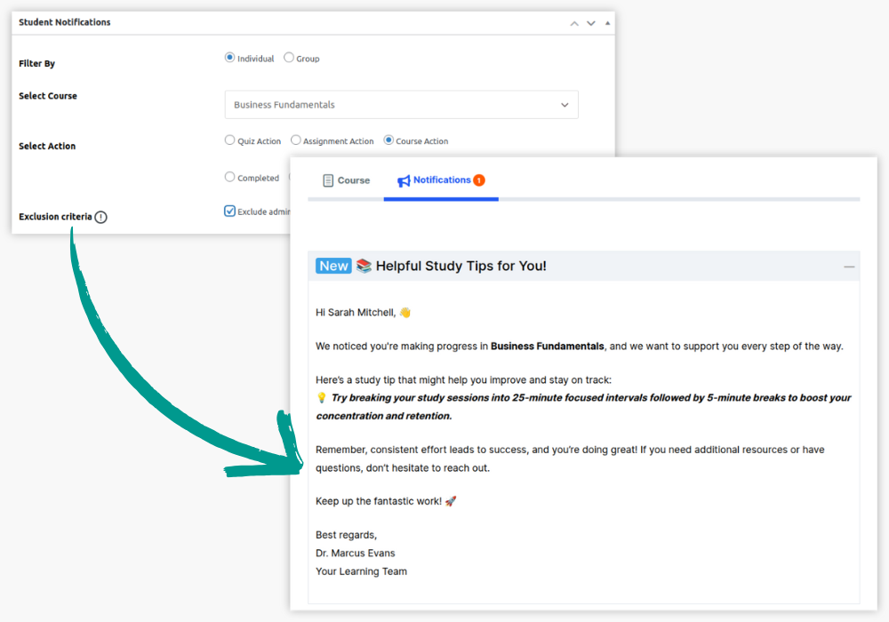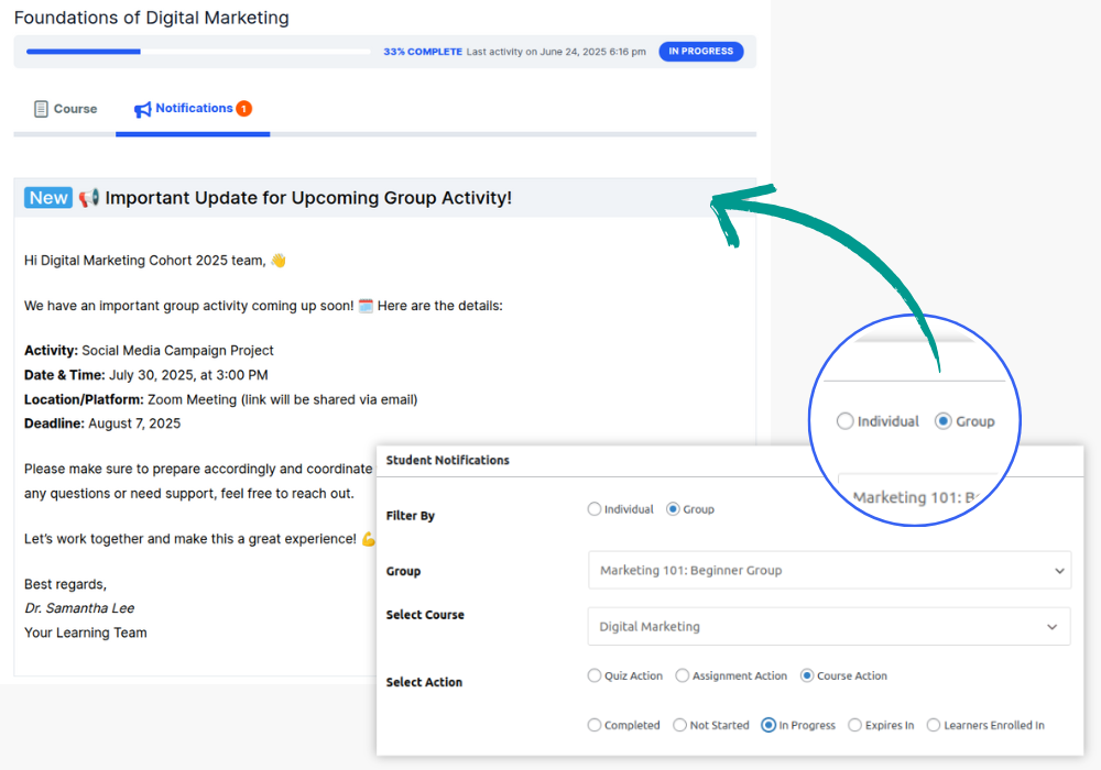 You can quickly filter students based on their progress, assignment submissions, or quiz scores, ensuring that your communication is highly relevant and effective.
