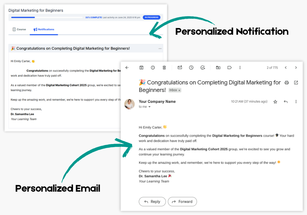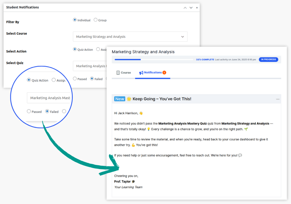 These personalized LearnDash notifications boost the emotional connection between the student and the course, making the learning experience more engaging and meaningful.