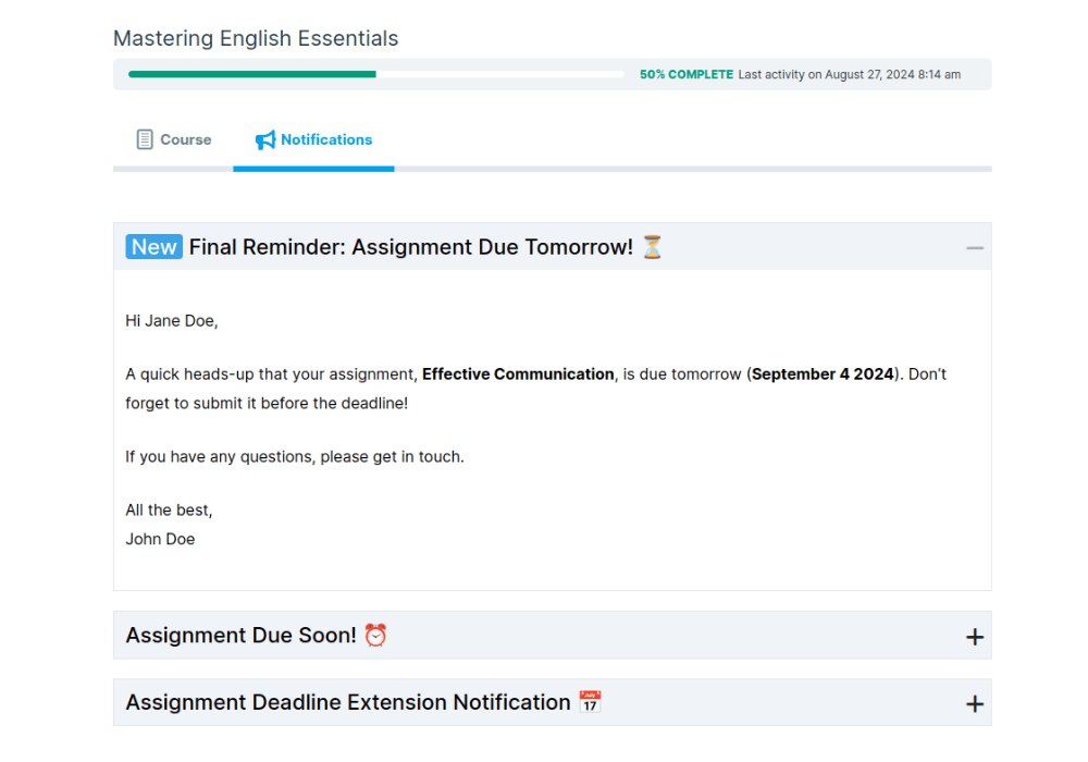 Integration with Assignment Deadlines Pro Plugin further polishes this gem, allowing for even more precise communication based on submission statuses. And for the cherry on top, students can revisit these LearnDash notifications anytime via a dedicated tab on their course page, ensuring no important message ever slips through the cracks.