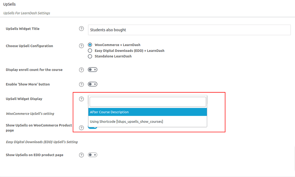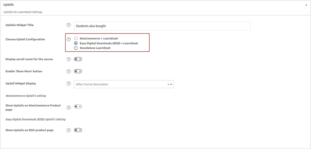 - Allows you to set UpSells in 3 configurations – With WooCommerce, EDD, and standalone LearnDash