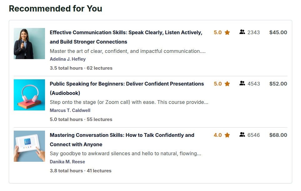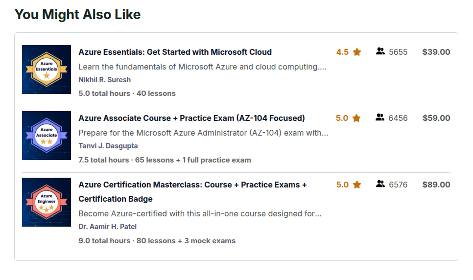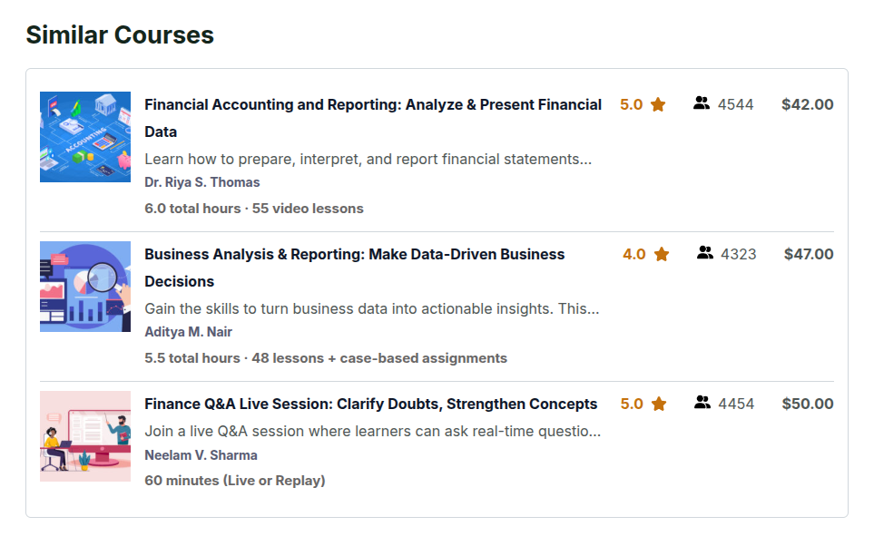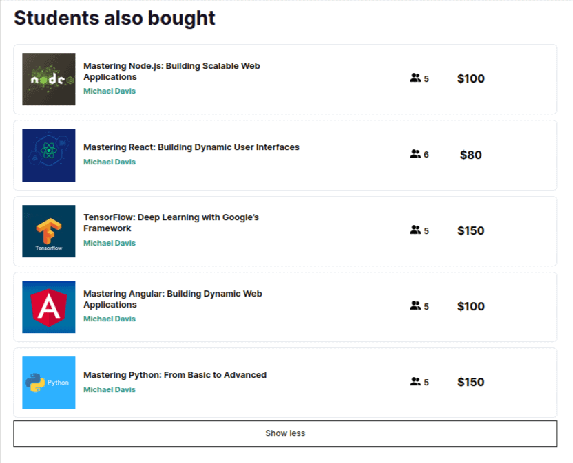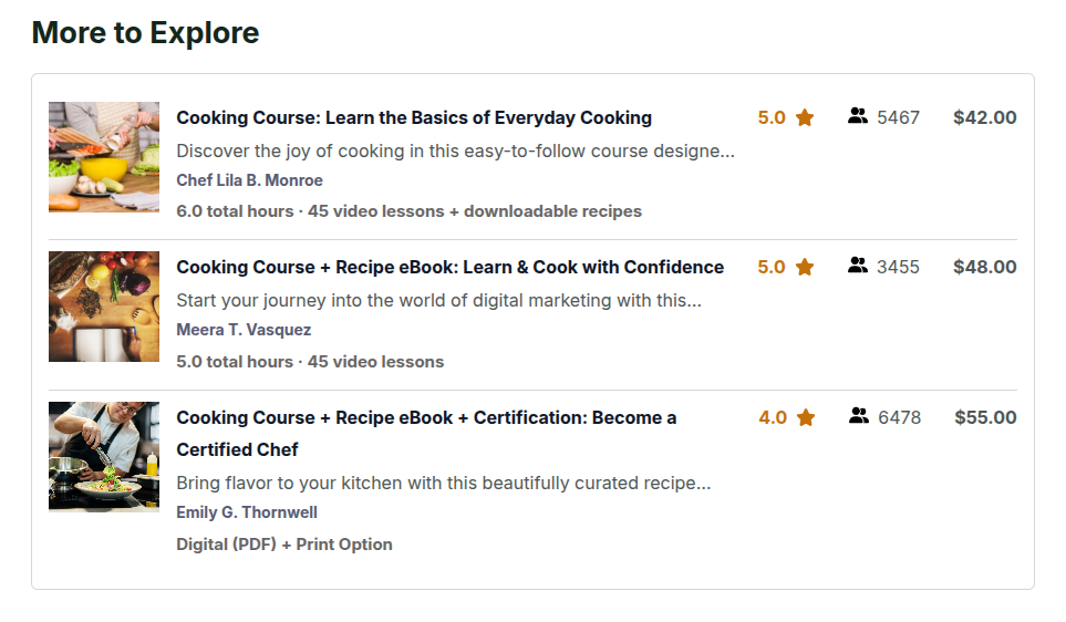 By offering relevant course recommendations directly on the course page, you enhance the learning journey for your students. This personalized approach not only makes it easier for them to discover new content but also reinforces the value of your offerings, leading to higher satisfaction and retention rates.