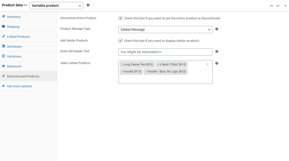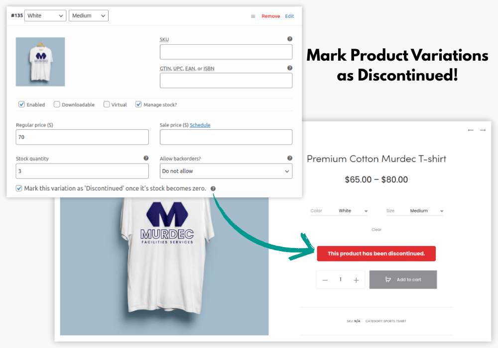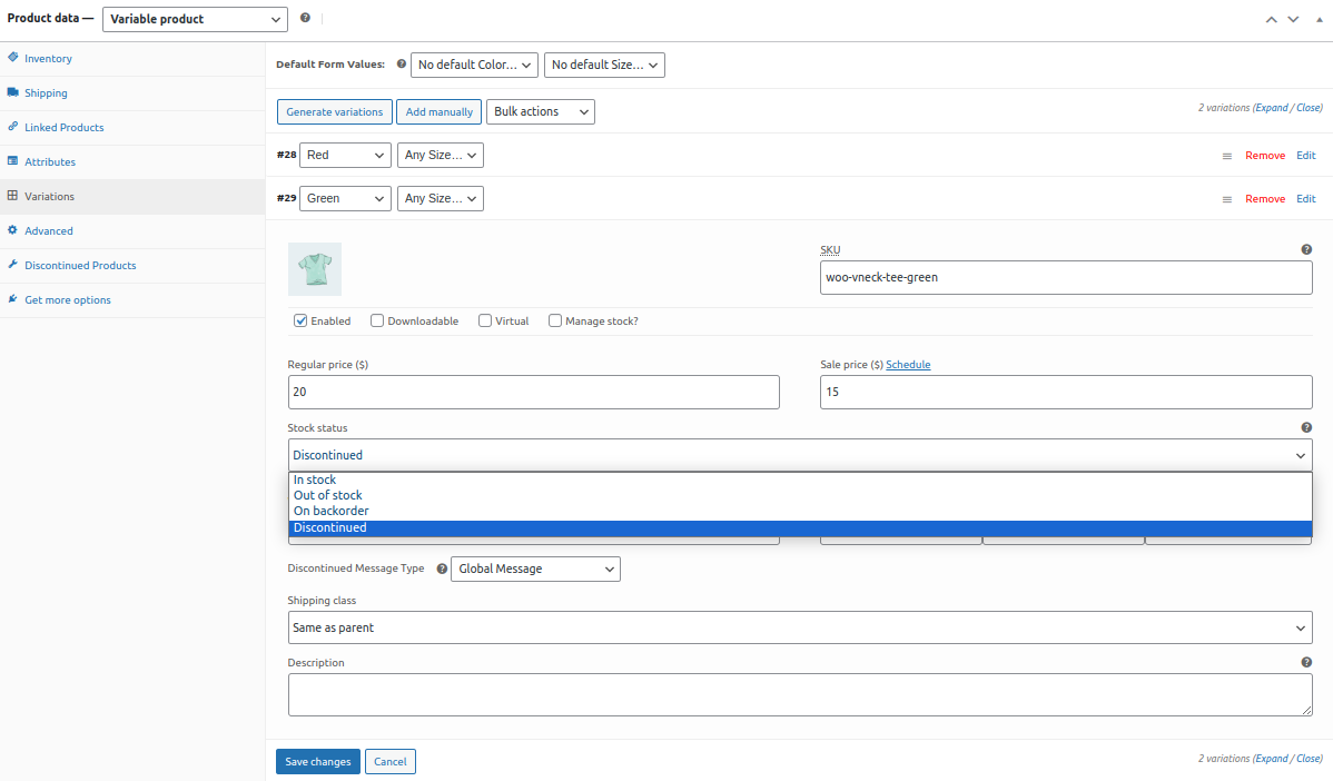 If your store sells variable products (such as clothing with different sizes or colors), you may discontinue specific variations (e.g., a size or color that will no longer be produced).