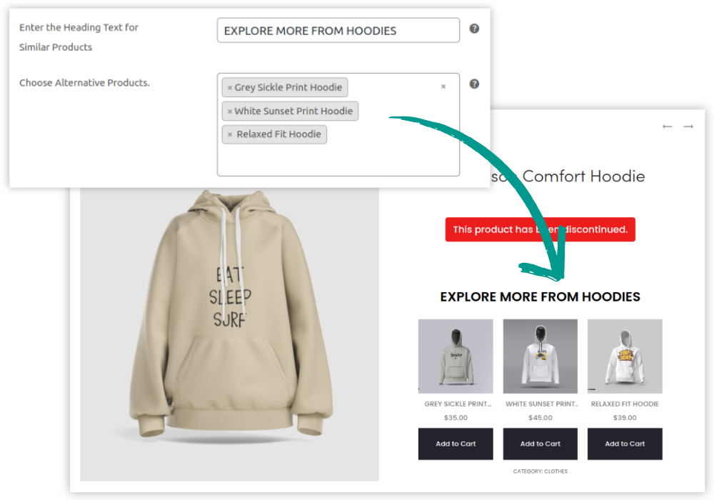 With this new feature, you can choose to show products that are good alternatives to the WooCommerce discontinued products directly on their product pages. This enables customers to make swift purchase decisions instead of expecting them to manually search for alternatives in your store.