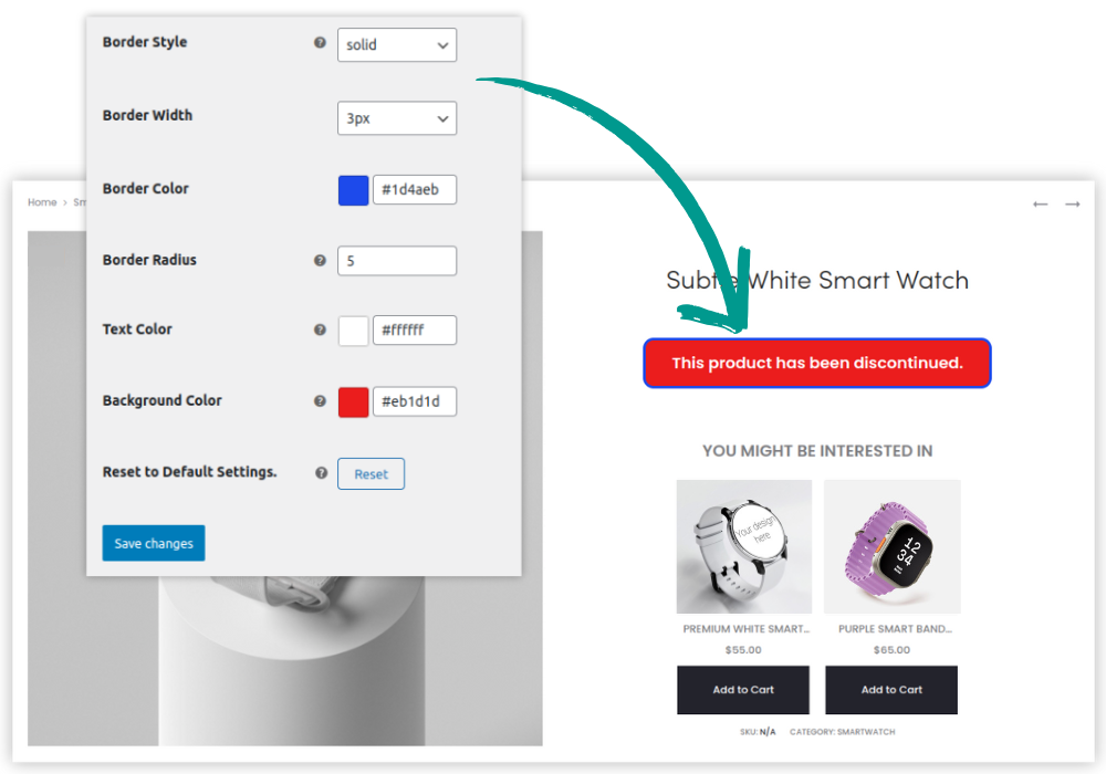 Whether you’re managing one item or many WooCommerce discontinued products, you can style your messages to blend perfectly with your website’s design, creating a cohesive and branded experience across all product pages.