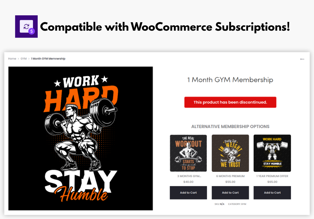 The plugin supports WooCommerce subscription products, marking them as discontinued when no longer available and recommending alternatives, ensuring subscribers always have access to the newest offerings.